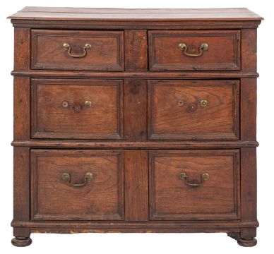 A Jacobean oak rectangular chest, containing two short and two long moulded panel drawers, on later bun feet, 86cm high, 97cm wide, 54cm deep.
