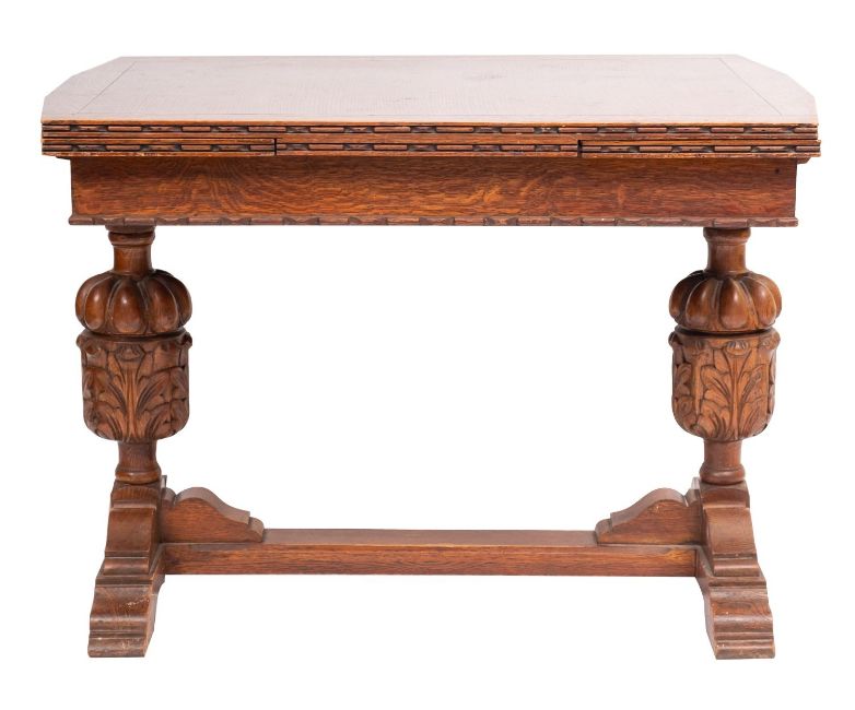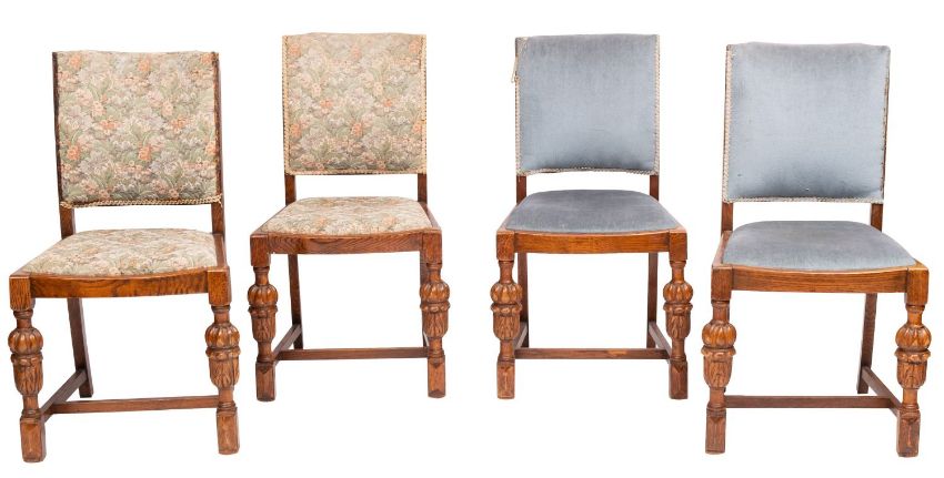 An oak draw leaf extending dining table in the 16th-century taste; the top raised on reeded and acanthus leaf carved bulbous end and trestle supports, united by a plain stretcher; 74cm high, the top 166cm long extended, 84cm wide; and a set of four matching dining chairs, circa 1930; with upholstered backs and seats