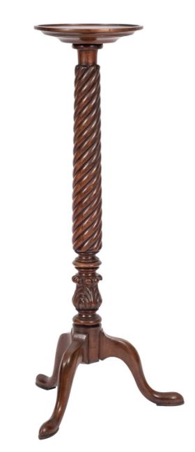 A carved mahogany circular torchere stand, in the Regency taste, 20th century; with spirally reeded and acanthus carved column, and tripod splayed legs terminating in pointed pad feet; 123cm high, 33cm diameter