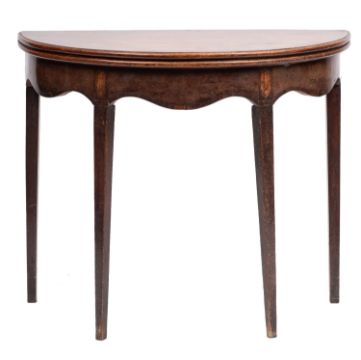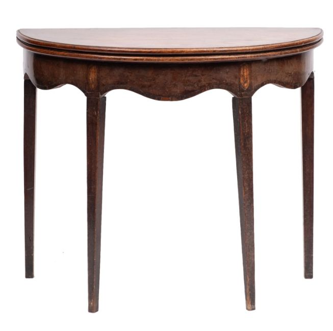 A George III mahogany demi lune tea table; the hinged top with a moulded edge, with a shaped and crossbanded apron, on square tapered legs, headed with oval foliate medallions; 74cm high, 92cm wide, 45cm deep
