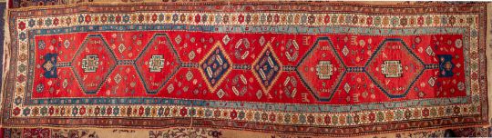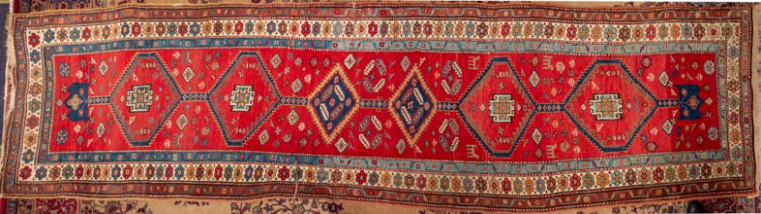 A Caucasian runner, the red field with a row of serrated lozenge and hexagonal medallions, scattered geometric designs and main ivory flowerhead border, 438cm x 110cm.