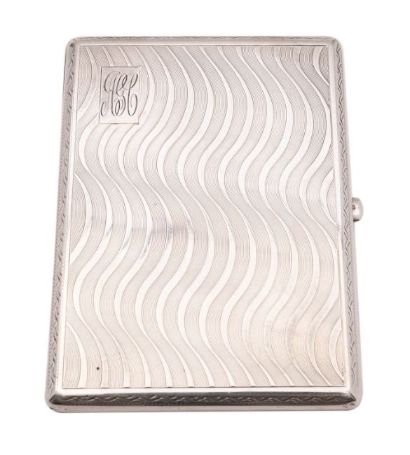 A George V silver cigarette case, maker's mark rubbed out, Chester 1927, of rectangular form, with wavy engine turning, 11cm high, 8cm wide, 125grams.