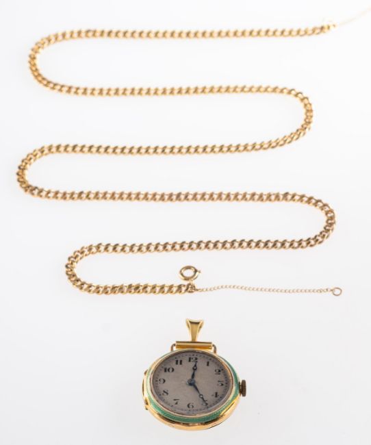 WITHDRAWNAn 18ct gold and enamel fob watch the silvered dial with black Arabic numerals and blued steel hands, the movement having a lever escapement and stamped Swiss Made, the case and inner cuvee hallmarked for 18ct 1909 and stamped G.S. possibly Stockwell & Co. (George Stockwell), with translucent green enamelled decoration and inset diamond to the centre, diameter 24mm, total weight ca. 21.35gms, with a curb link chain marked for 9ct gold, length 52cm, total weight ca. 17.81gms.