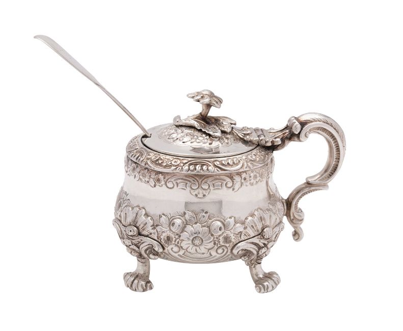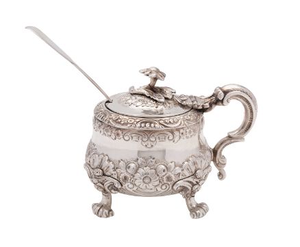 A George IV silver mustard, maker Samuel Whitford II, London 1822, of compressed baluster form, the slightly domed hinge lid with cast flower finial, high 'C' scrolled handle, the body decorated with embossed flower, scrolled cartouche with engraved crest with Earl's Coronet and raised on shell capped scrolled feet, 9.6cm high, together with an Exeter silver Fiddle pattern mustard spoon, Robert Williams & Sons 300grams