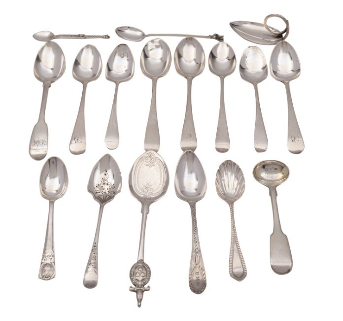 A collection of silver teaspoons, to include a nine teaspoons, various styles, dates and makers, a leaf caddy spoon, a Georgian salt spoon, three coffee spoons, two preserve spoons and a modern Scottish salt spoon, 250grams.