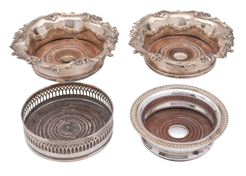 A pair of William IV Old Sheffield Plate wine coasters, unmarked, in the Rococo Revival style, of shaped circular form, the applied edge with foliate scrolls and floral motifs, together with two later plated coasters, (4).
