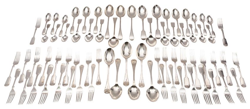 A matched canteen of silver flatware, various dates and makers, mostly Victorian and London, Fiddle, Thread and Shell pattern, comprising of four table spoons, eight dessert spoons, six tea spoons, two sauce ladles, eight table forks and eight dessert forks, 2590grams, 83.2 ozs, (36).