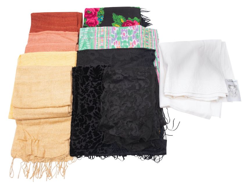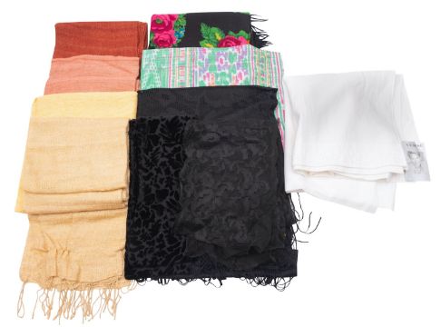 Jaeger and others. A collection of various silk and other scarves.