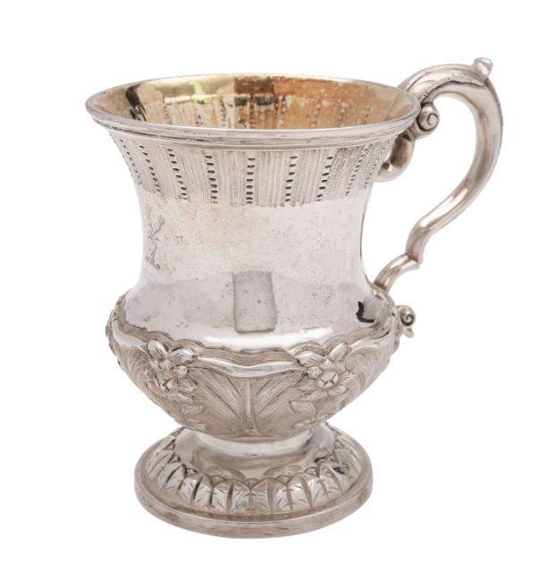 A William IV Irish silver mug, possibly James Le Bas maker's mark over struck with sovereign's head, Dublin 1834, of thistle shape, the reeded rim with chased border, plain band engraved crest, the lower section with raised and chased flower motifs on a collet base, high 'C' scrolled handle, gilt lined interior, 11.5cm high, 255grams.