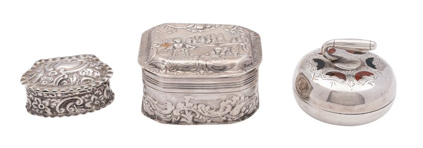 A silver and hard stone novelty curling stone box, makers mark J.F, other marks rubbed date letter a, with engraved decoration and inset stones, 5cm diameter together with a 'D' shaped pill box, Synyer & Beddoes , Birmingham 1891 and a Dutch silver snuff box, import marks Alfred Lewis, London 1903, embossed decoration, (3).