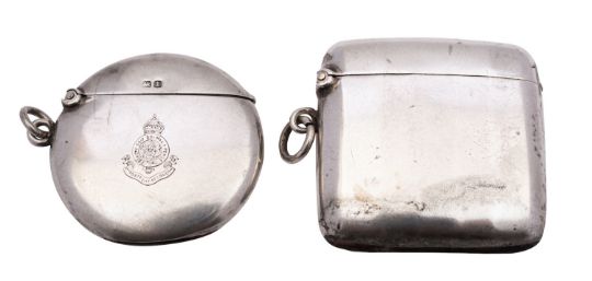 Of Military interest: A George V silver vesta case, Walker and Hall Ltd, Birmingham 1910, of circular form, engraved crest for the 2nd Batt City of London, together with a plain rectangular silver vesta case, 50 grams (2).