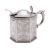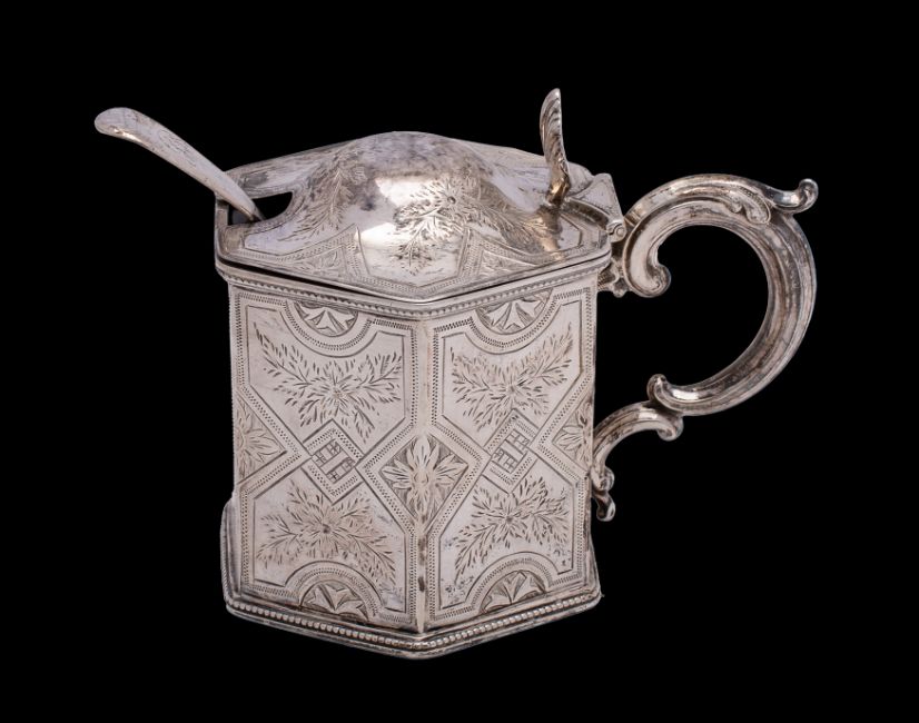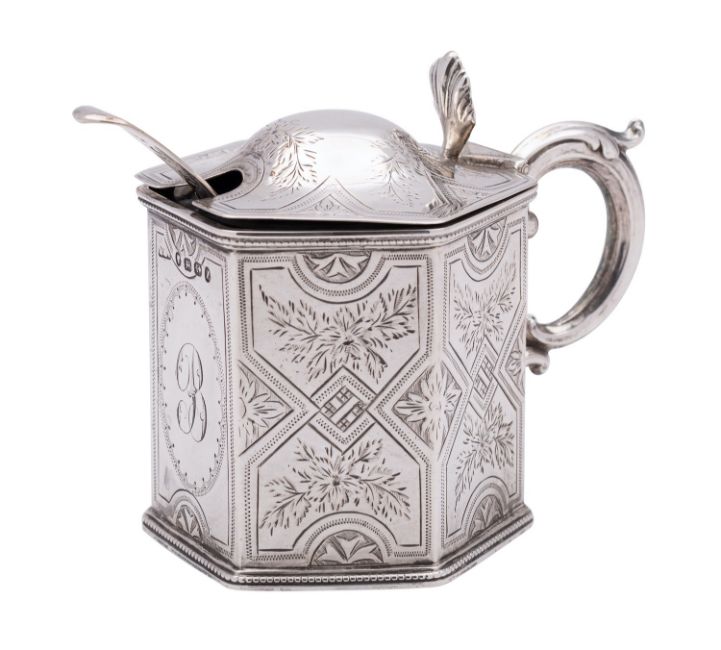 A Victorian silver hexagonal lidded mustard, maker probably Hilliard & Thomason, Birmingham 1874 having engraved floral foliate and geometric decoration, domed hinged cover with shell thumb piece and foliate capped scroll handle, having blue glass liner, 117gms, 3.7ozs, together with a Georgian condiment spoon by William Eley and William Fearn.