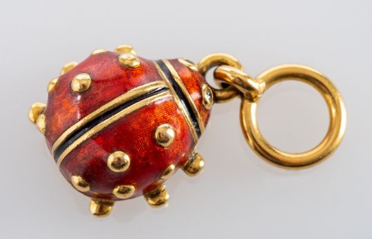 A red and black enamel ladybird charm, with diamond eyes, stamped '750', total length (inc jump ring) ca. 2.4cm, total weight ca. 4gms, accompanied by pouch.