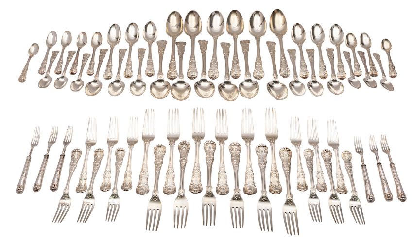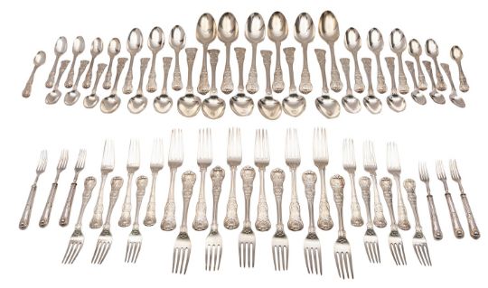 A George IV silver canteen of flatware, William Chawner II, London 1827, Kings pattern, double struck, with engraved scrolled initial R, comprising of twelve table spoons, eleven table forks, one table fork Charles Eley, London 1825, twelve dessert spoons, twelve dessert forks, eleven tea spoons, one London 1849, makers mark rubbed, two coffee spoons, together with six silver fruit forks, Alexander Hunt, Sheffield 1919, 4450grams, seven silver plate and steel table knives and thirteen side knives.