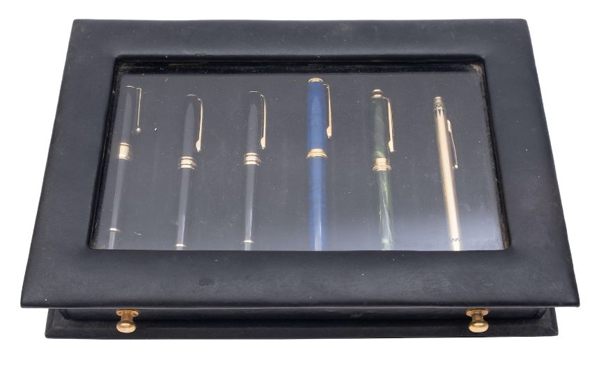 A Pierre Faber fountain pen and roller ball pen set, black with gilt fittings, together with a similar L'Plume fountain pen and Eversharp gold plated propelling pencil and two marbled roller ball pens in a black display case.