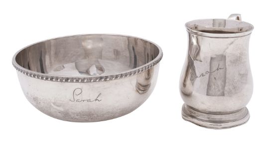 A George VI silver bowl, H Phillips, London 1946, a circular bowl with gadrooned rim, engraved Sarah, 12cm diameter, together with a silver christening mug of baluster form also inscribed Sarah, 300grams, (2).