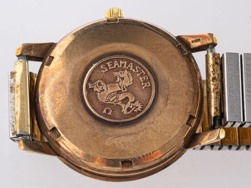 Omega a gentleman's gold wristwatch the champagne dial with raised gold and black baton numerals, a sweep seconds hand, baguette hands and signed Omega Automatic Seamaster, with a gold-plated bracelet, the case embossed to the rear with the Omega, Seamaster logo, diameter 35mm, total weight 71.04gs.