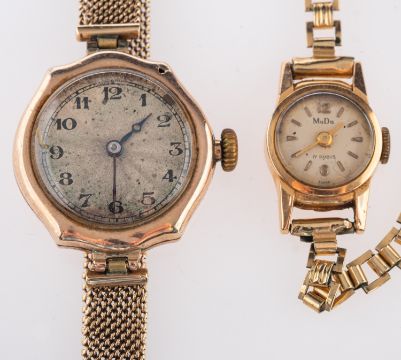 Rolex Prima, a lady's gold wristwatch the silvered engine-turned dial with black Arabic numerals, the movement signed Rolex Prima, the shaped case stamped within for R.W.Co. Ltd along with the usual Rolex markings and serial number 8874, the bracelet stamped for 9ct gold, diameter 26mm, total weight ca. 22.25gms.Mudu, a lady's 18ct gold cocktail watch the dial with Arabic and baton numerals and signed Motu, the round case stamped 18K, with a gold-plated bracelet, diameter 15mm, total weight ca. 10.00gms.