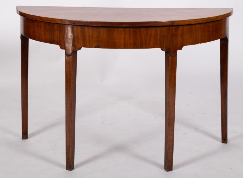 An early George III mahogany demi-lune table, circa 1770; previously one end of a dining table, with straight tapered legs; 73cm high, 120cm wide, 54cm deep