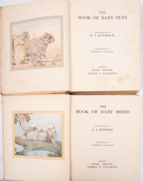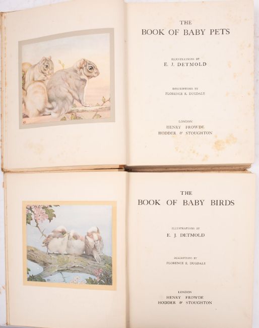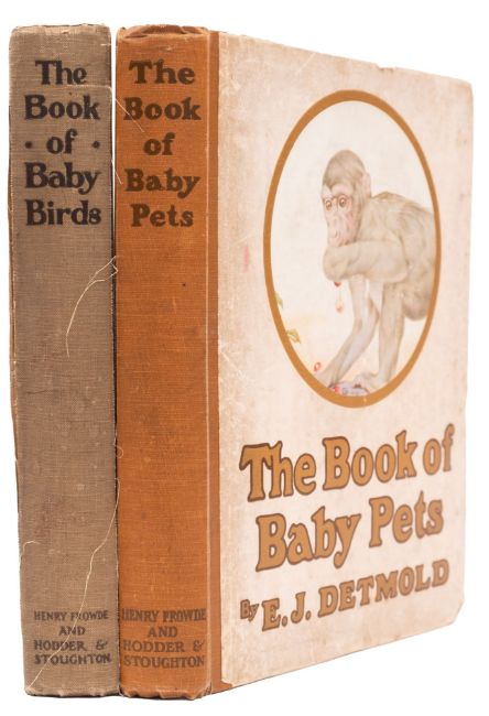DETMOLD, E.G. The Book of Baby Pets (illus by E.G Detmold), colour plates, original cloth backed pictorial boards, slightly soiled and chipped at the edges, 4to, publisher Henry Frowde (1915) - together with The Book of Baby Birds, colour plates, original cloth torn on spine, with pictorial boards slightly soiled, publisher Henry Frowde (1912) (2).