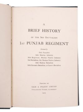 LAWFORD, Ltn-col J.P., and Catto, Mjr W.E., Soloah Punjab, The History of the Sixteenth Punjab Regiment, maps and plates, 8vo, original cloth in dust wrapper, 1967, with Anon, A Brief History of the Third Battalion first Punjab Regiment, 8vo, original cloth, 1927, with Rollinson, H.G., The History of the 2/6th Rajputana Rifles, folding maps, 8vo, original cloth in dust wrapper, 1936 (3).