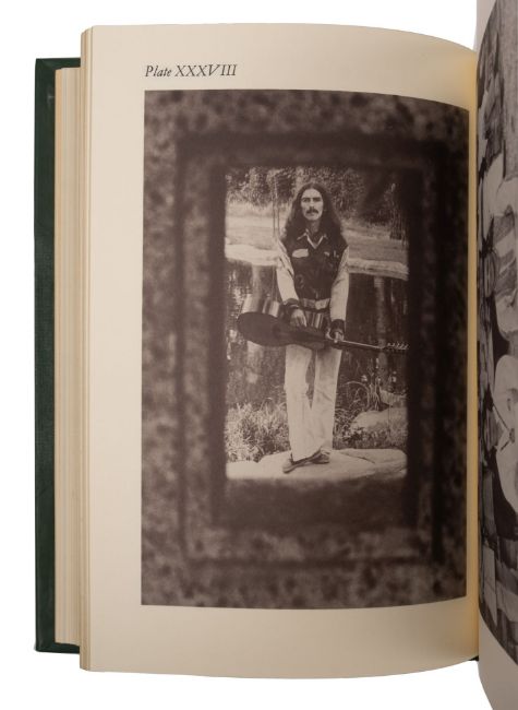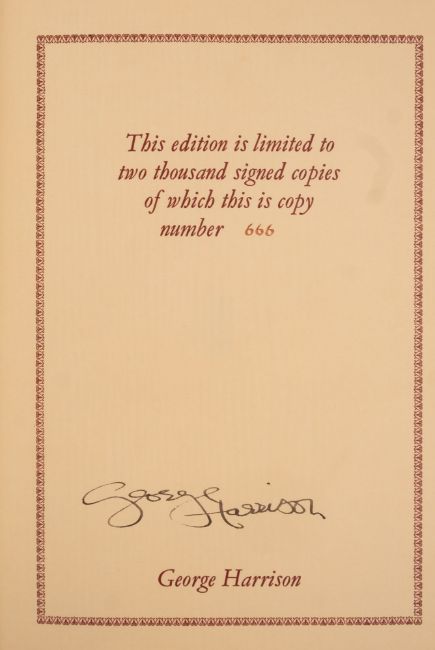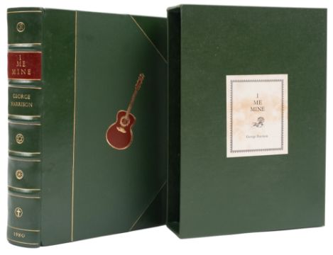 HARRISON George, Many illustrations including, facsimile letters, half green calf with central device of a guitar on the upper cover, possibly a Gibson SJ200 Acoustic, morocco label on the spine, 4to, limited edition of 2,000 signed copies by George Harrison, of which this is 666, in a matching slip case with a paper label, which is slightly stained. Genesis publications 1980.