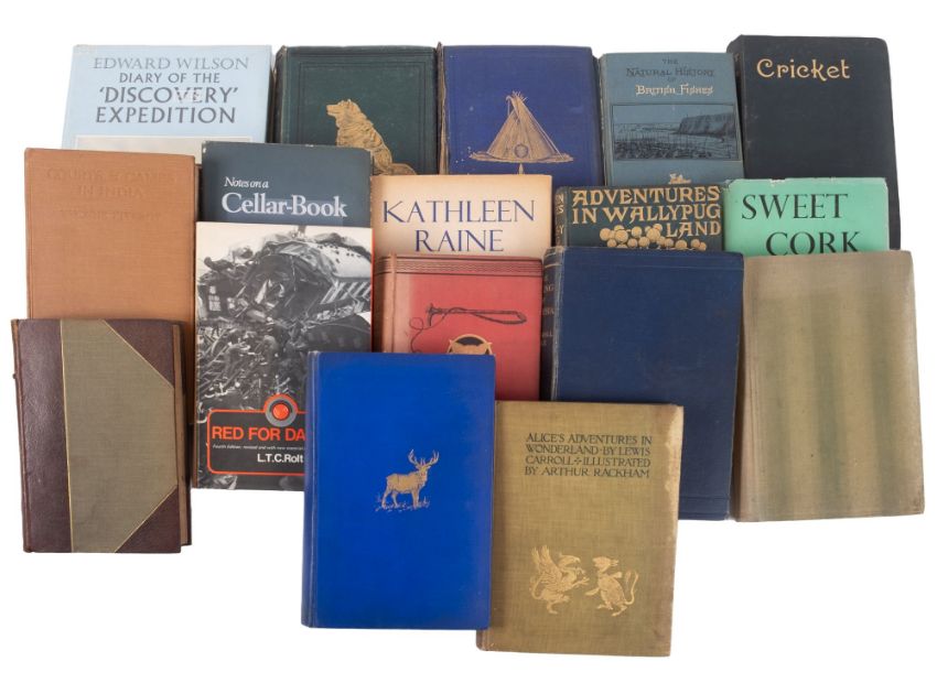 RACKHAM, Arthur ... (illustrator) Alice's Adventures in Wonderland : 12 colour plates. Org. pictorial cloth damp faded on the edge of the covers, endpapers spotty. 8vo .Heinemann, first edit. (1907). With a box of books on misc subjects.