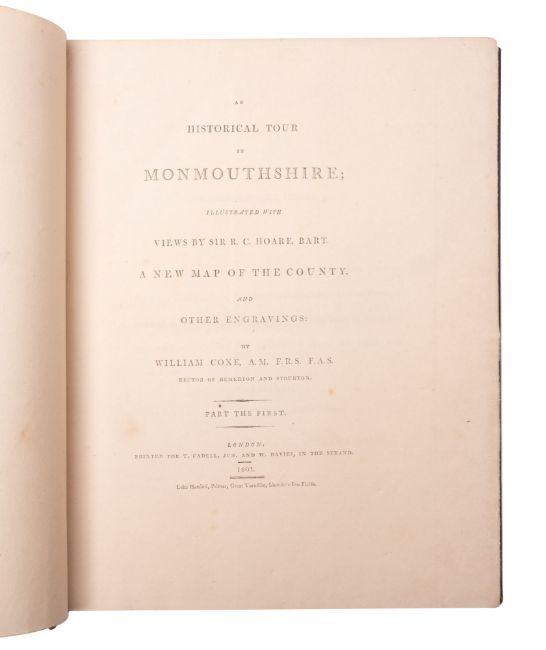 COXE, William, An Historical Tour in Monmouthshire, illustrative of views by Sir R.C. Hoare, Bart, 2 vols, folding engraved county map by Nathaniel Folkland, full diced calf, worn on hinges, large 4to, printed through Cadell and Davies 1801. *with 93 additional plates bound in. (2).