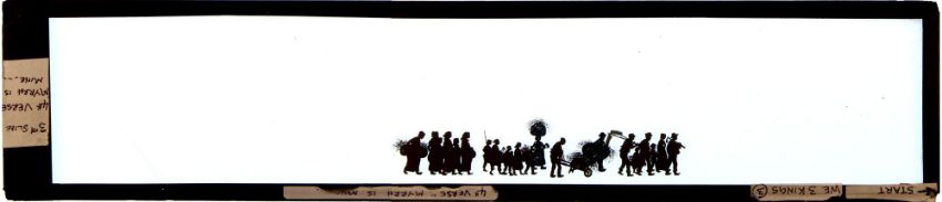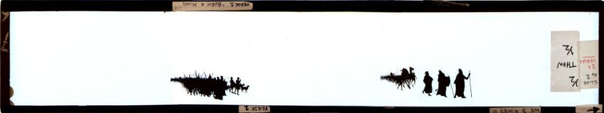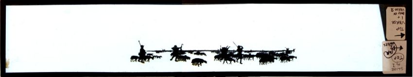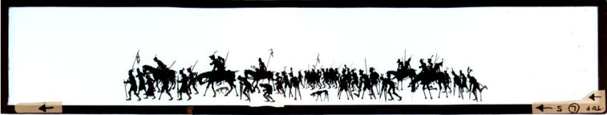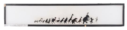 French silhouette long slides Group of 16 slides from various sets. Double glass sheets with paper edge binding strips Maker unknown, dimensions as shown. 'Marching army' 45 x 8.3 x 0.3cm 'Sailing ship' 45 x 8.3 x 0.3cm 'Group of sailing ships' 45 x 8.3 x 0.3cm 'Procession of people' 39 x 8.3 x 0.3cm 'Marching army 31 x 8.3 x 0.3cm [broken; probably originally c.39cm in length] 'Army marching with Arab followers' 40 x 8.3 x 0.3cm 'French army marching' 26 x 8.3 x 0.3cm 'Crusader army marching' 39.5 x 8.3 x 0.3cm Hunting party galloping '40.5 x 8.3 x 0.3cm' 'Defeated army returning' 45 x 8.3 x 0.3cm 'Defeated army returning' 45 x 8.3 x 0.3cm 'Group of people carrying tools etc.' 39 x 8.3 x 0.3cm 'Crowd of people, some riding camels' 40 x 8.3 x 0.3cm 'Three Kings' 45 x 8.3 x 0.3cm 'Shepherds and flock of sheep' 45 x 8.3 x 0.3cm 'Procession of exotic animals' 45 x 8.3 x 0.3cm *Notes- This group of French panoramic silhouette slides are after the work of Emmanuel Poire, known as 'Caran D'Ache' (1858-1909). When projected the figures are striking in their boldness and convey the story with clarity. They challenge the viewer's perspective of war, showing the futility of war and the stupidity of battle. The contrast between marching soldiers with flags flying and encouraged by well-wishers on their way to war and the sad return of the wounded limping home is clearly seen. The group of four slides 'La marche a L'etoille' shows the shepherds following the star of the East and would have been used at Christmas time in venues like the Theatre d'Ombres Chat Noir.