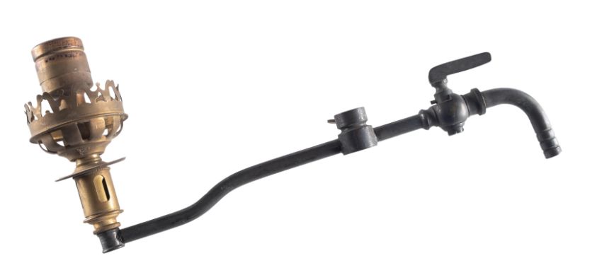 A lacquered brass Incandescent gas burner, for use with town gas, 27.5cm long