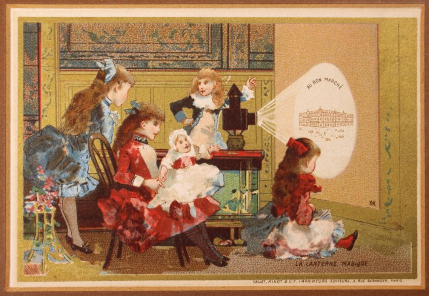 A late 19th cebtury French trade card of children playing with magic lantern Paris: Au Bon Marché, circa 1890s; 11 x 7.5 cm, mounted