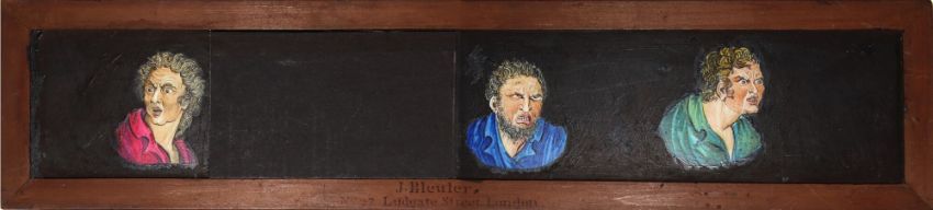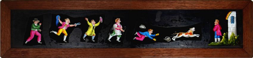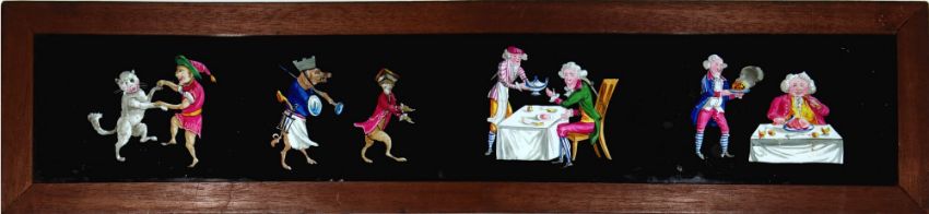 Three comic panoramic long slides, comprising 'Men dining with animals in costume' Maker unknown (17 x 3 7/8 x 1/4 inches) 'Four grimacing faces' [one blacked out] J. Bleuler, London (17 x 3 7/8 x 1/4 inches) 'Group of people chasing dog' Maker unknown (17 x 4 x 1/4 inches)
