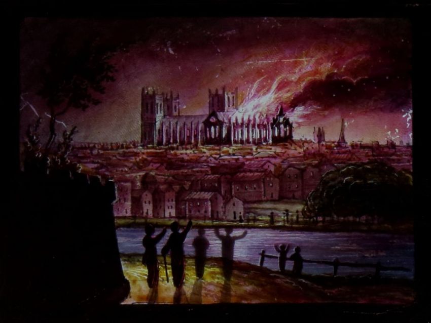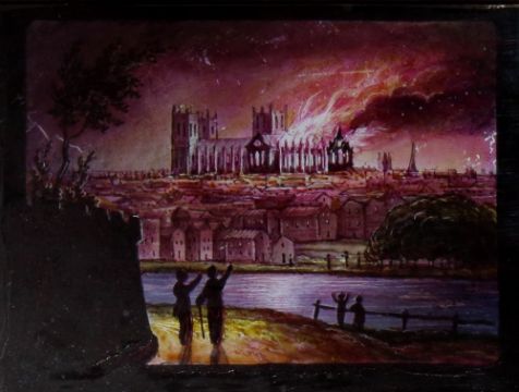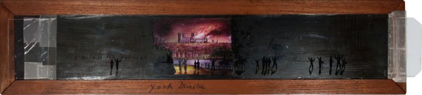 'York Minster' [succession of silhouette figures pass across foreground] Maker unknown (17 1/8 x 4 x 3/8 inches), single panoramic slip