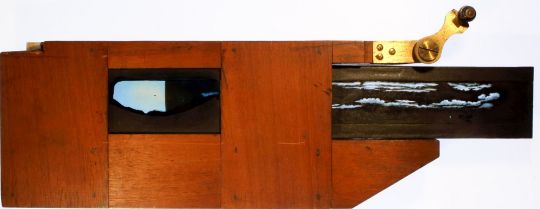 Panoramic slip slide with concealed pulley mechanism - 'Clouds move across night sky' Maker unknown; 11⅞ x 4½ x ⅝ inches
