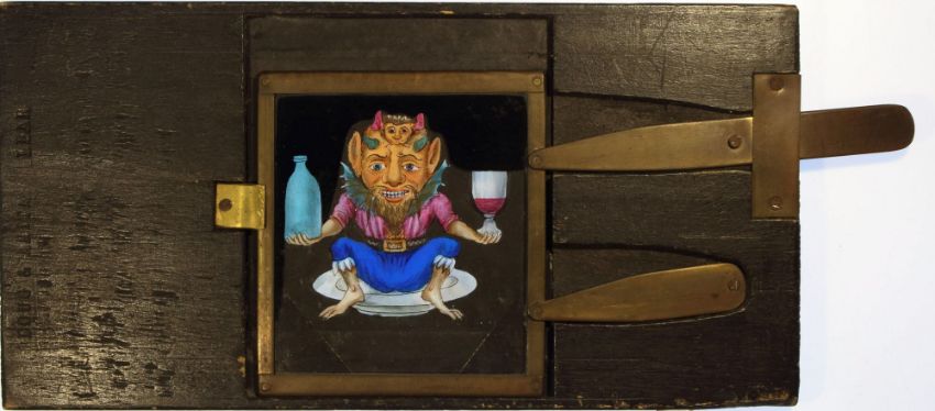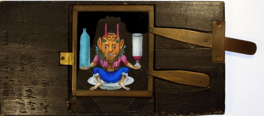 Pivoted-lever slide - 'Demon with changing bottles' Desch, Paris; 21.5 x 11 x 1cm signed and dated 'Desch 1859'