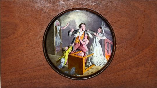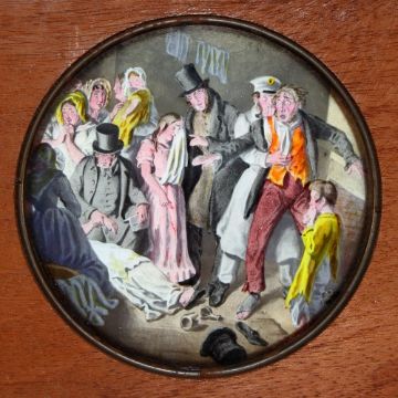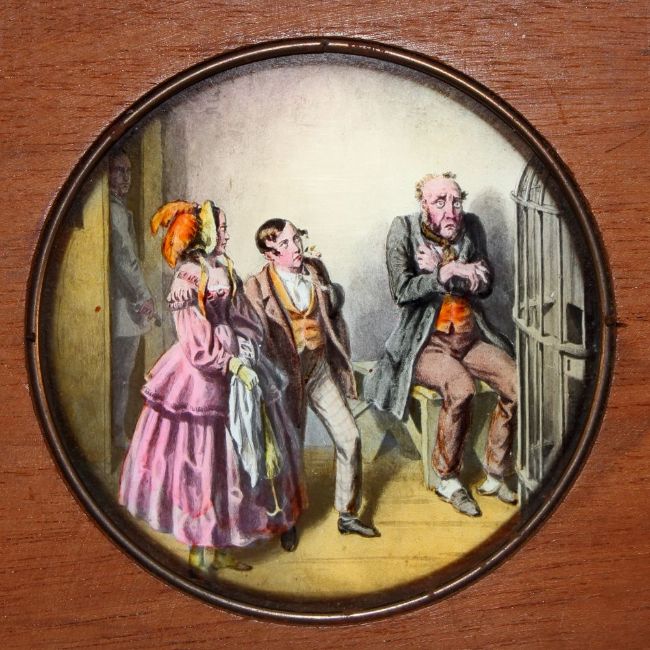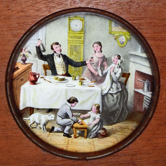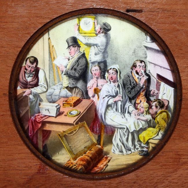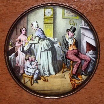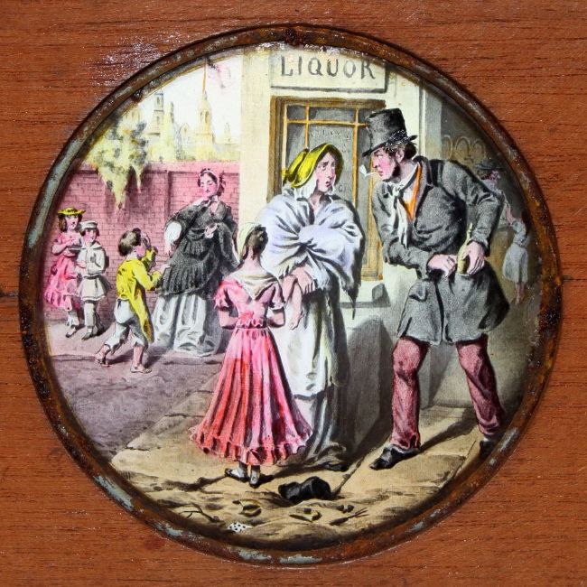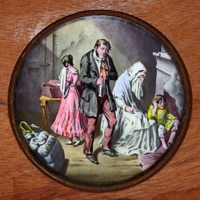 'The Bottle' Set of eight slides after Cruickshank's series of engravings. Single hand-coloured glass slides in wooden frames,( 7 x 4 x 3/8 inches). Maker unknown.