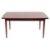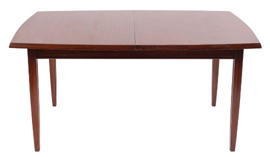 A stained hardwood extending dining table, by Heal & Son Ltd., circa 1960s; the rectangular top with shallow bowed and cleated sides and ends, the extra leaf housed beneath the top, inset with a circular maker's plaque; on straight tapered legs, 74cm high, 150cm long closed, 92cm wide; and a set of six stained hardwood and upholstered dining chairs, 86cm high, 48cm wide