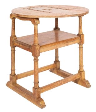 A light oak open monk's armchair in 17th-century style, 20th century; with a sliding circular carved rosette hinged top, solid seat, and trestle supports; 74cm high, 75cm diameter