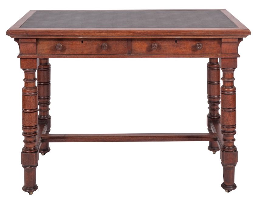 A Victorian red walnut writing table, by Gillow & Co., second half 19th century; the top with later inset faux black leather skiver and moulded edges; above twin drawers each with two turned knob handles, one drawer stamped GILLOW & CO 7496, on ring and knop turned legs with H form stretchers and concealed castors; 75cm high, 107cm wide, 60cm deep