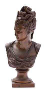 After Jean-Antoine Houdon, (French 1741 - 1828), a patinated bronze bust of a maiden, portrayed with head declined a little to dexter, her hair tied up and richly adorned, atop a waisted circular section plinth with square socle; 34cm high