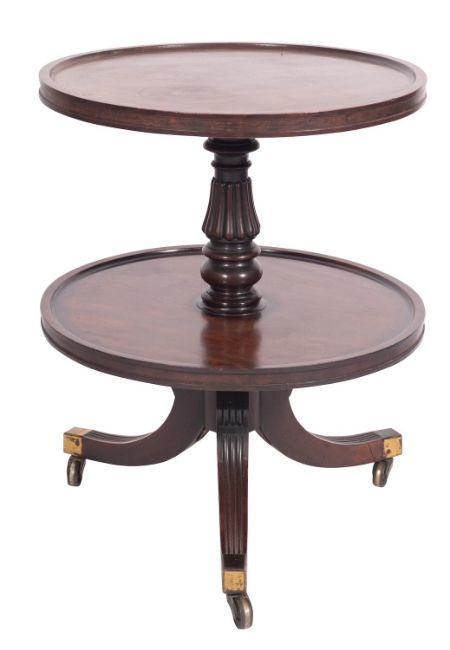 A Regency mahogany two tier dumb waiter, in the manner of Gillow, early 19th century; the circular single-piece shelves with raised outer edges, with lobed baluster and knop turned shaft, above three hipped and reeded splayed legs to brass caps and castors; 72cm high, 61cm diameter