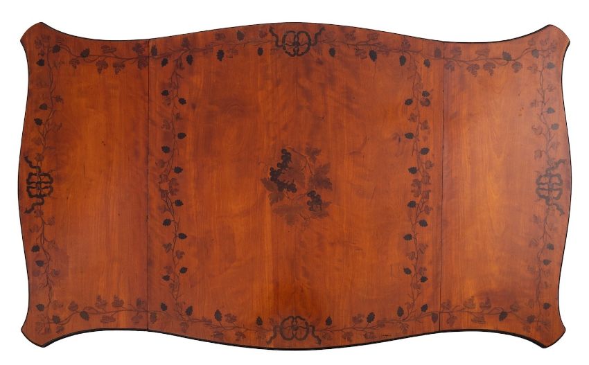 A George III satinwood and marquetry Pembroke table, late 18th century; the rectangular top with serpentine front, back and sides, with twin drop leaves, with central fruiting grapevine motif within a conforming border; the drawer with twin bone handles, opening to a velvet writing surface, a paper label inside printed RT. HON. LORD HOTHFIELD, with faux drawer to the back, on slender cabriole legs to brass caps and castors; 70cm high, 94cm wide opened, 57cm deep