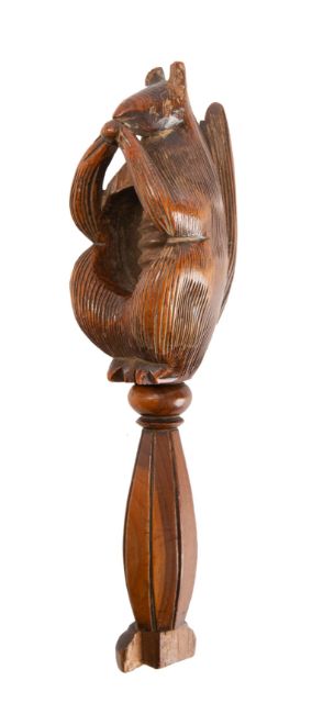 A Victorian carved treen nutcracker in the form of a squirrel, mid 19th century; modelled as seated on its haunches, its forepaws raised and holding a nut to its mouth, the tail raised behind, the screw with faceted baluster handle, 17cm long; (chipped losses to handle)