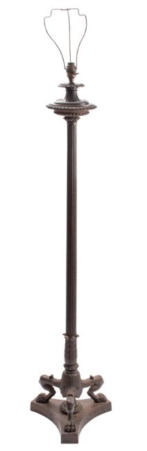 A Regency cast iron standard lamp, circa 1815 and later adapted for electricity; with a fluted boss with egg-and-dart cast rim; on a reeded shaft to three acanthus cast monopodia, on a triform base; 138cm high including electrical fitment