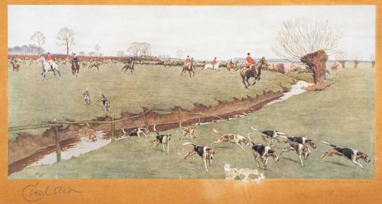Cecil Charles Windsor Aldin (British,1870-1935)HuntingTwo coloured printsEach 18 x 32.5cmBoth signed lower left and numbered 135 from the edition of 185,from the series of the twelve 'The Hunting Counties of England',together with a map of British Hunts by Rosemary H.Coates, signed and numbered 155/500