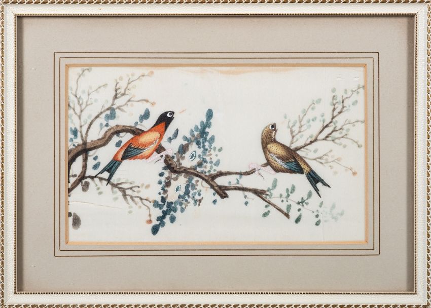 A set of six Chinese pith paintings of exotic birds amongst flowering branches, Qing Dynasty, 10 x 17cm [minor damage] framed.