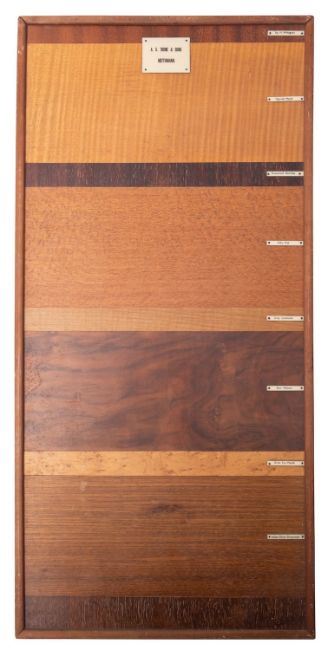 A timber merchant's veneer sample board, mid 20th century; for A.S Toone & Sons, Nottingham; of rectangular double sided form, the various specimens with plastic labels for Nigerian walnut, Betula, Macassar ebony, Queensland walnut, zebrano, figured African mahogany, and eleven others; 66cm high, 31cm wide