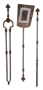 A set of Regency steel fire irons, early 19th century; comprising shovel, poker and tongs; the grips with circular pommels above knopped shafts; the shovel 68cm long.