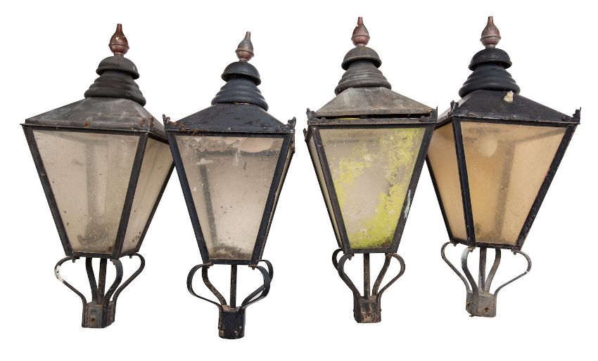 A set of four black-painted copper and acrylic lanterns, basically early 20th century; of square section, all with copper finials above vented domes and pyramidal tops, with cut metal stylised foliate acroteria at the corners; the acrylic panes probably later; on openwork fitments; 112cm high, 42cm square; (lacking posts)