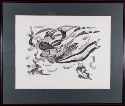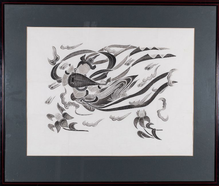 A pair of Balinese woodblocks, depicting musicians playing stringed instruments, 50 x 66cm, together with a similar 44 x 39cm, framed and mounted.